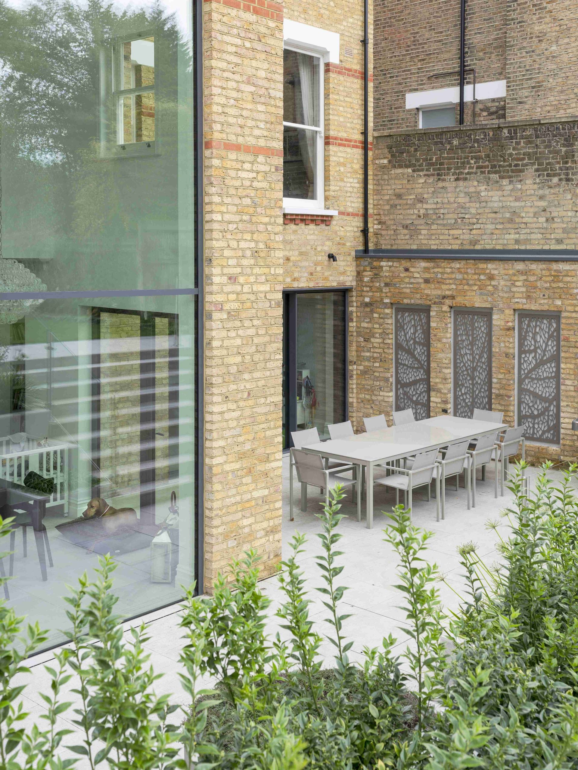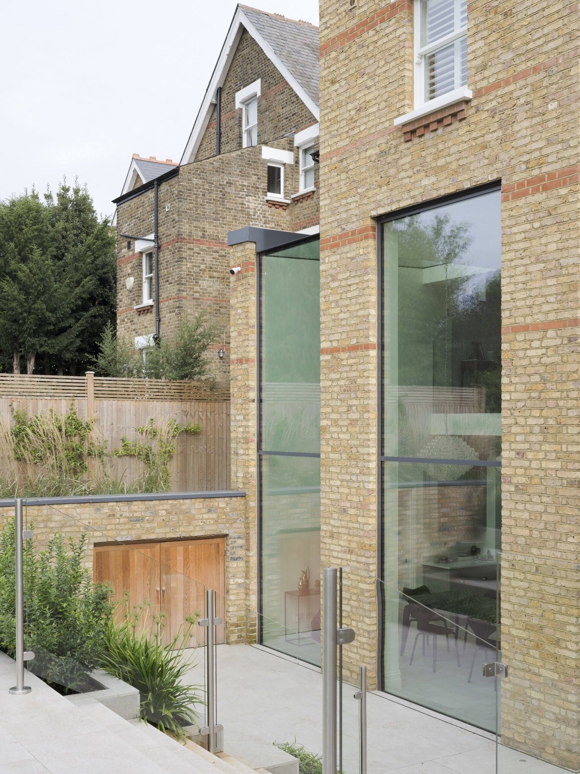 The original building line remains virtually unchanged and this project sits harmoniously in its surroundings. While inside we were continuously challenged to marry contemporary designs with the existing Victorian features of the house. A wonderful example of this being the preservation of the stained glass entrance door in the ground floor hall; a period feature heightened by the use of parquet flooring.Throughout the house, storage spaces were designed to be almost invisible. The bespoke cupboard paneling in the home office responds to the need for a traditional aesthetic while creating a clean and modern space for its user.