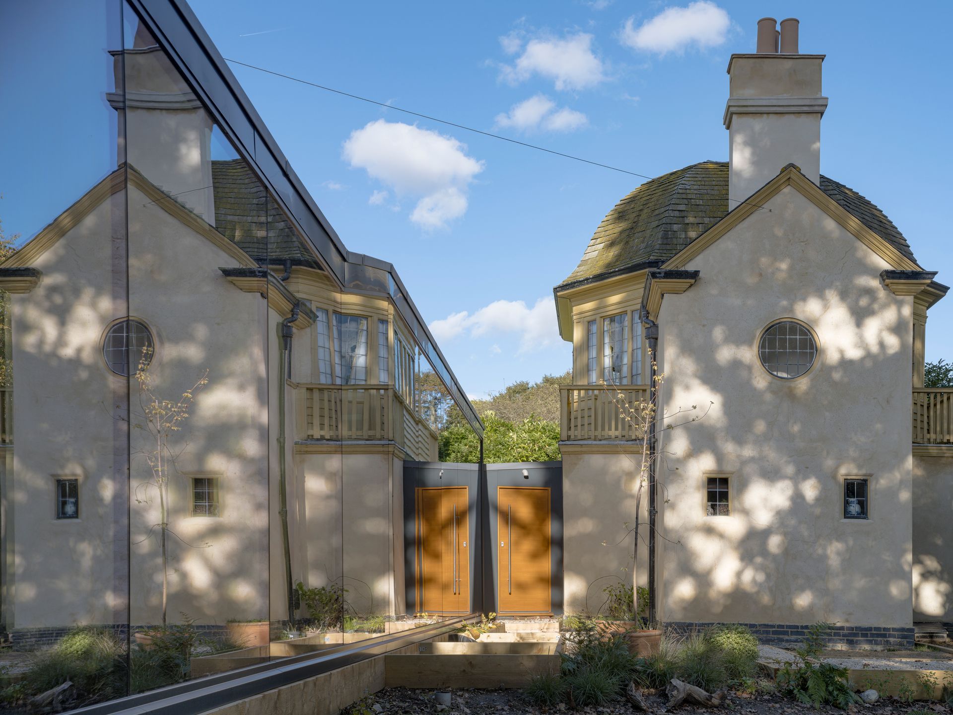 Originally built in the late 19th century as a Summer House for the owners of the estate the Pavilion resides on, it faced dereliction and even fire over the course of its history. The clients wanted to find a way to expand their home while adhering to strict historical limitations, enhancing the Pavilion’s unique features and maintaining harmony with the surrounding Grade II historic parkland. The core aim of this project was to meticulously restore the Pavilion while seamlessly integrating modern living spaces, cleverly concealed behind glass that reflects the surrounding pavilion and gardens. The bathroom and kitchen were relocated to a side and rear extension, discreetly separating the Pavilion from the new addition.