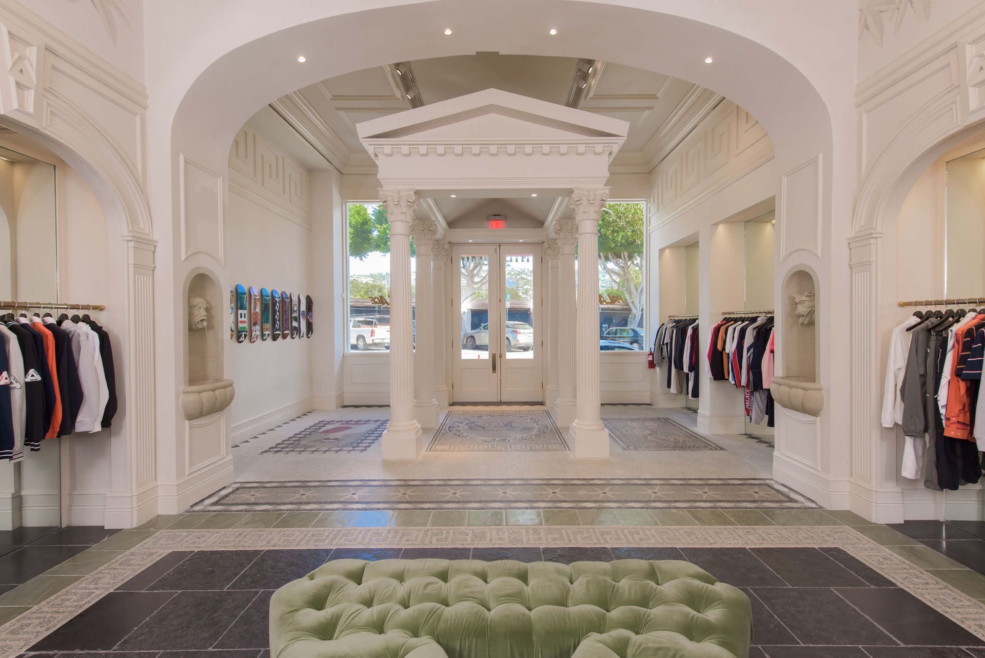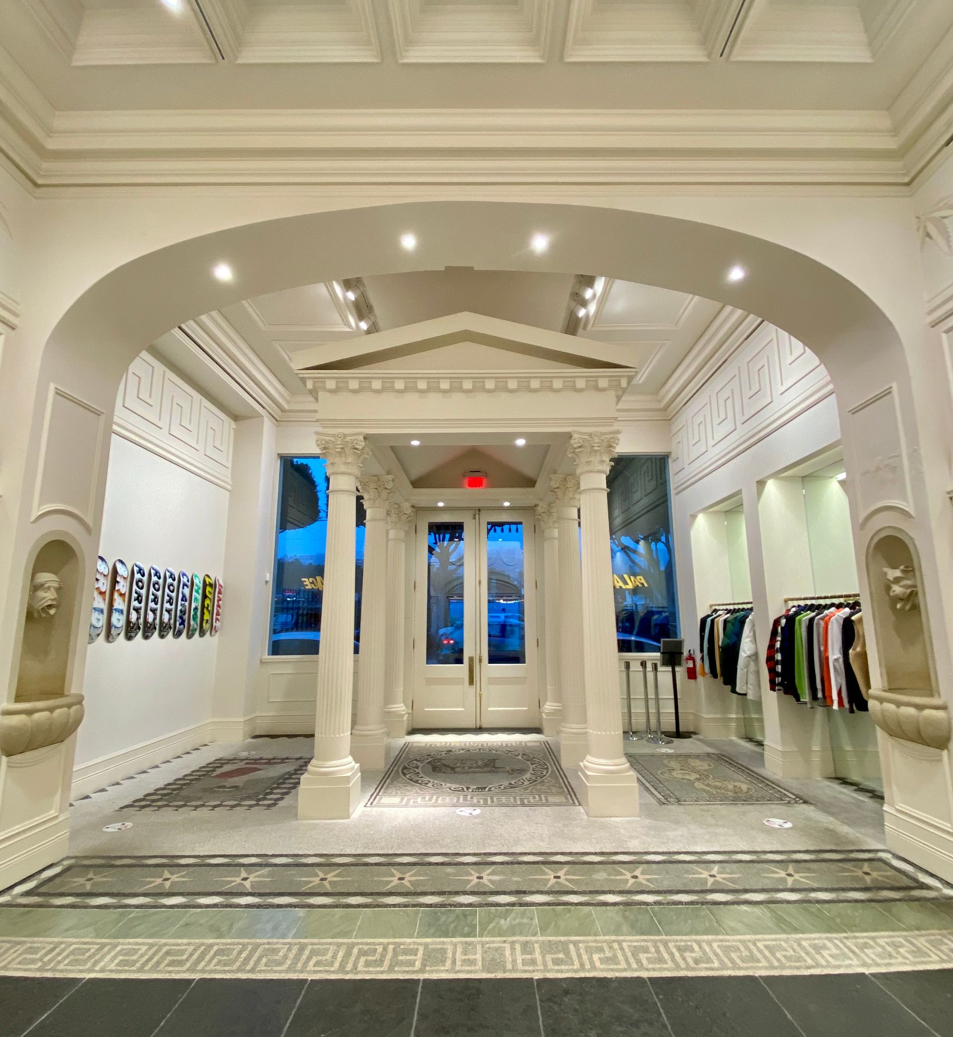 Palace Skateboards, an extremely successful streetwear company with a limited edition and ever changing product line, is the kind of company that is always up for a new and unconventional approach to retail. They wanted Krueger Architects design-build team to pursue their mantra of moving away from the expected with the design of their second retail store in the U.S. The direction was ancient Roman juxtaposed with LA Punk! The new store located in Los Angeles launched shortly after their flagship U.S. store debuted in Soho with a “Versace 80’s” vibe.