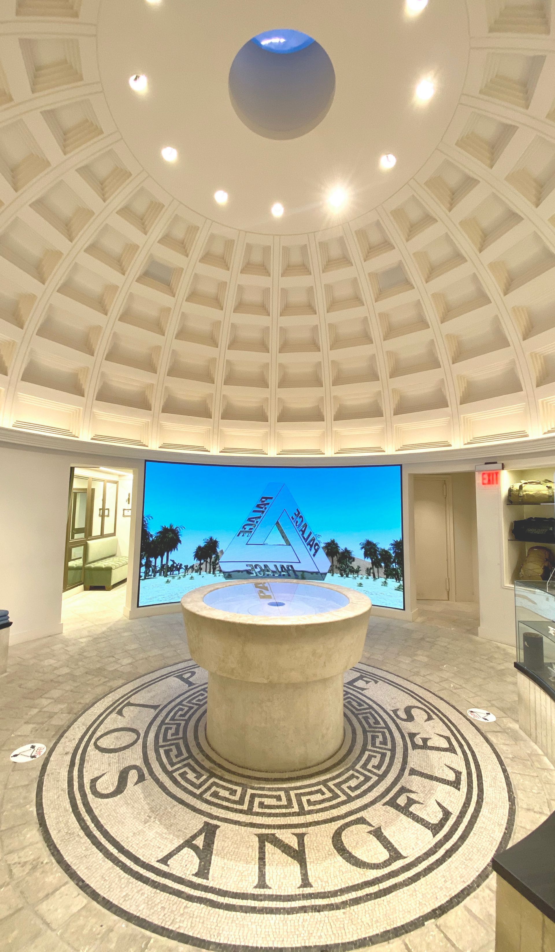 At the center of the point of sale space is a 2,000 lb fountain meant to be in the shape of a sundial. The stone fountain contains a video projector. The carved stone cap is the perfect size to conceal the projector. A constant loop of Palaces award winning videos displays on the 13′ x 7′ curved seamless screen on the back wall of the store. For the LA store we introduced Palace to video mapping. which is the icing on the dome! The dome had to be perfectly modeled and installed for the mapping to be calibrated and display properly. Lighting, sound and HVAC were tucked above and behind moldings and a complete facade was built to remind all of the company’s British heritage.