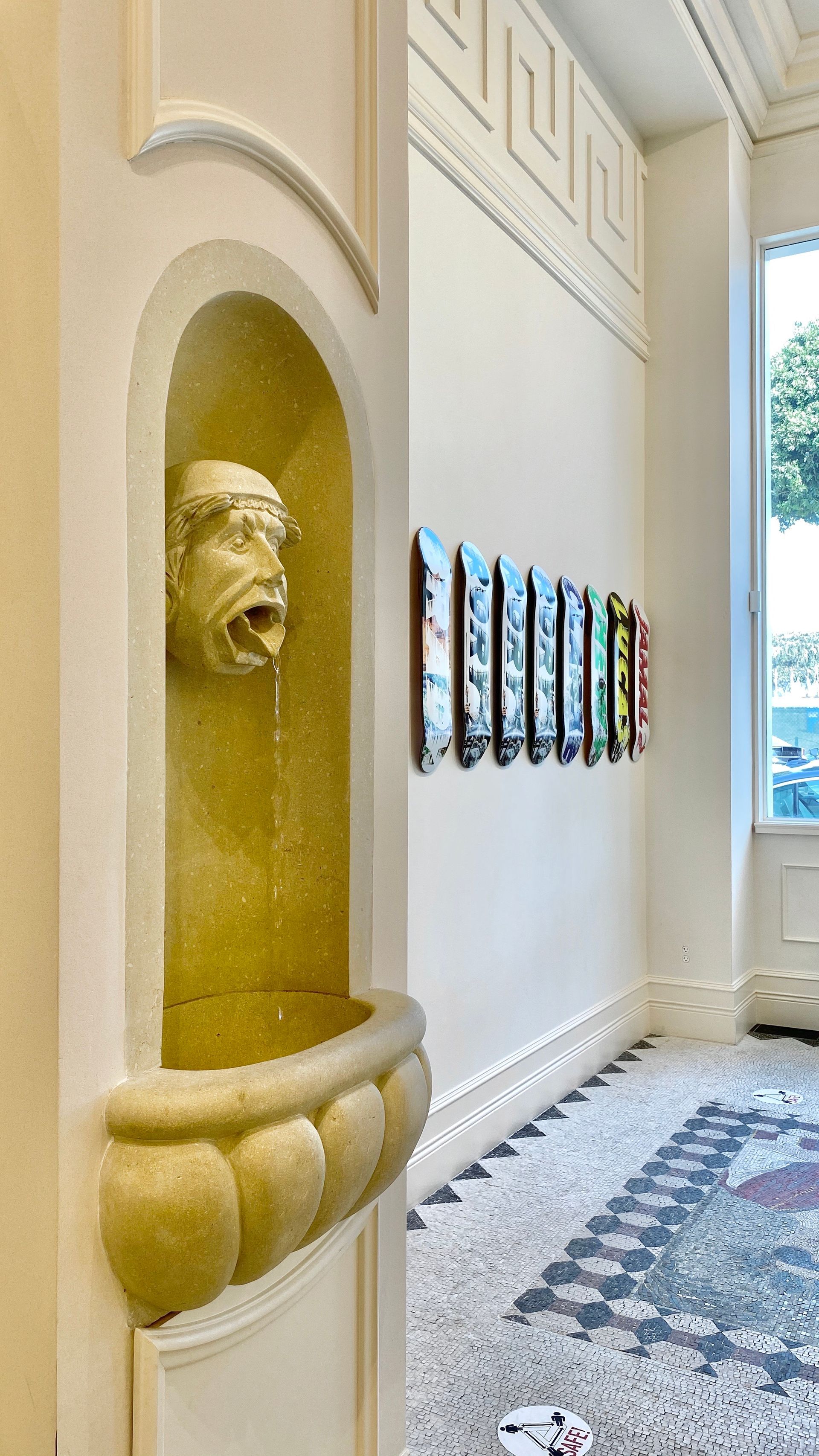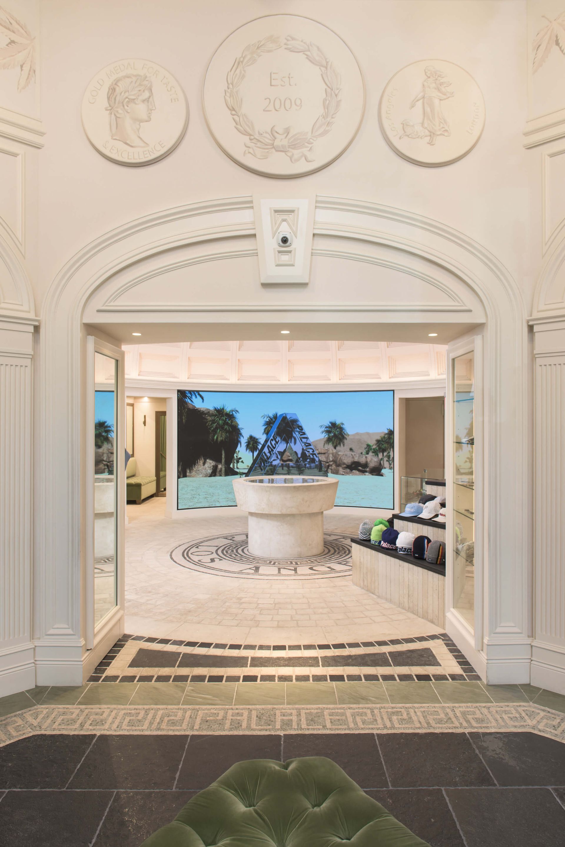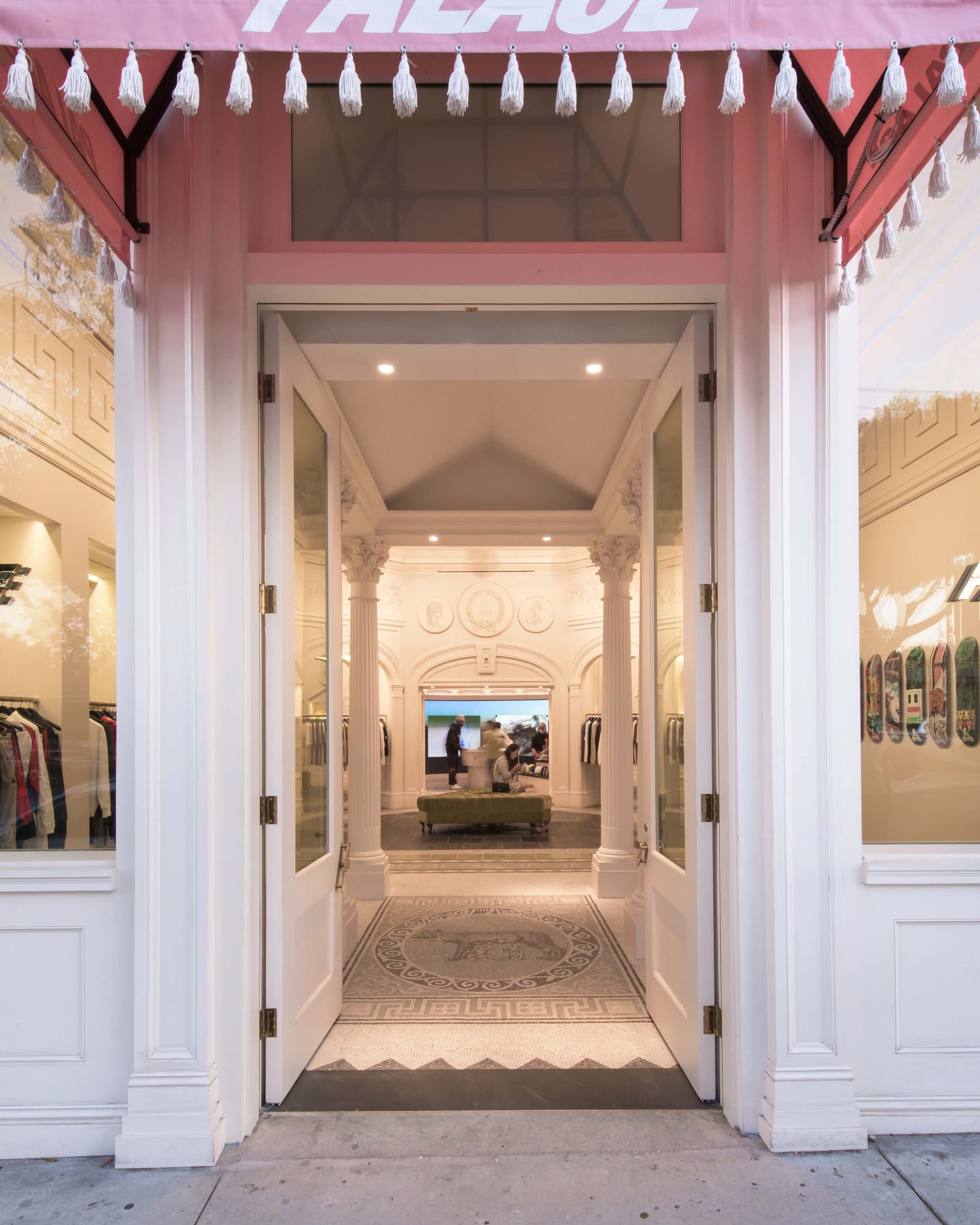 The pink awning with custom white fringe detail (an absolute must for one of the company’s partners) shows the customer to the door. Door handles fabricated in the shape of the letter ‘P’ in Palace, open the double doors. Inside you proceed under the cover of a Roman-style temple. Six pillars support the structure, which reveals itself as a temple as you enter further into the gallery space of the store.