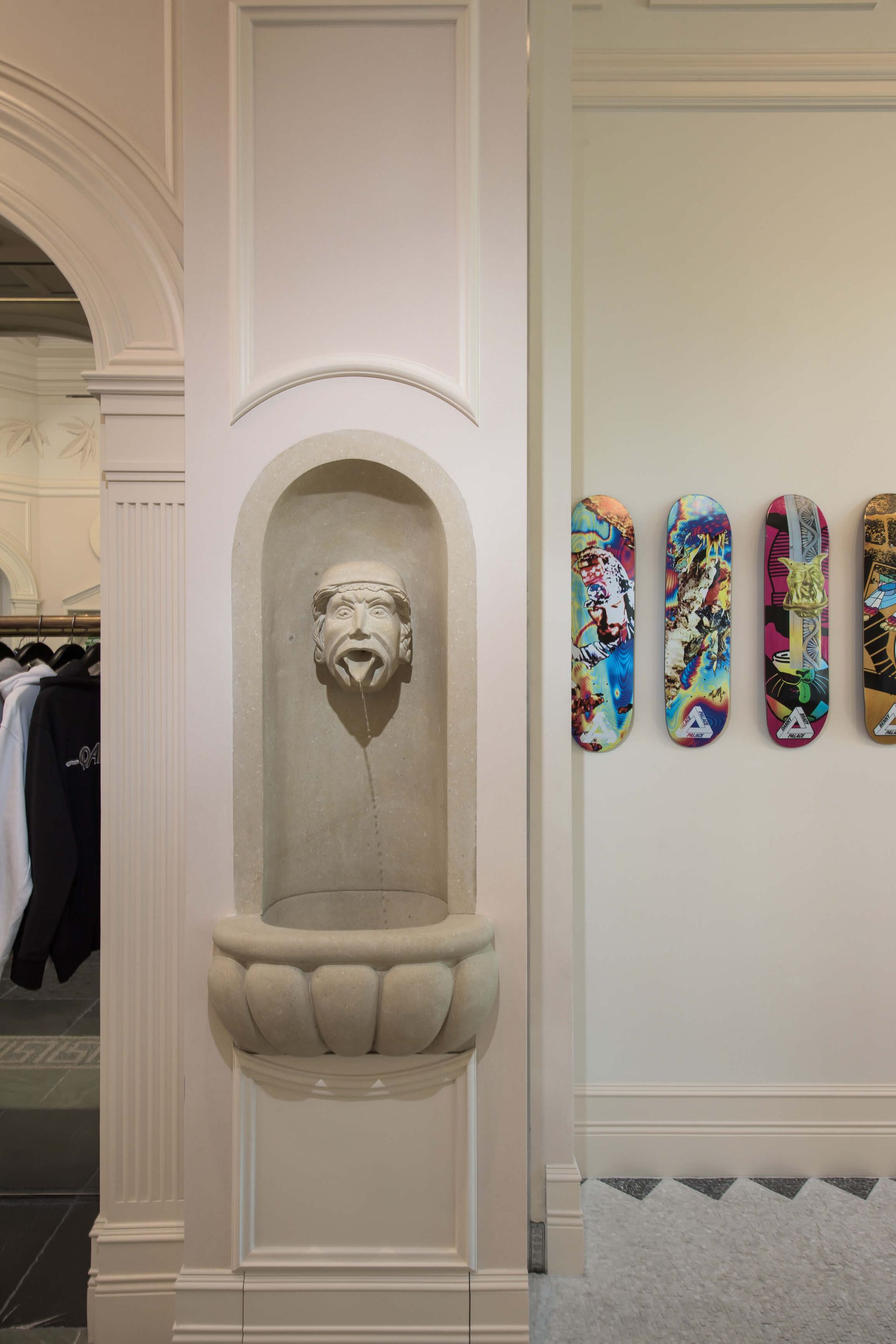 On the right is a gallery wall to display Palace’s skateboards. Encircling the rest of the space are racks to display the latest “drop” of garments. The garment displays are arched alcoves inspired by Romanesque architecture. They are backed with mirrors that visually expand the space by bounce light throughout. Clothing is displayed in the store to show colors and styles with the full inventory of the stock in a backroom. This allows the clothing to be easily discovered and selected. We were determined to move away from the clutter of freestanding racks and the trendy “pop up” like stores.