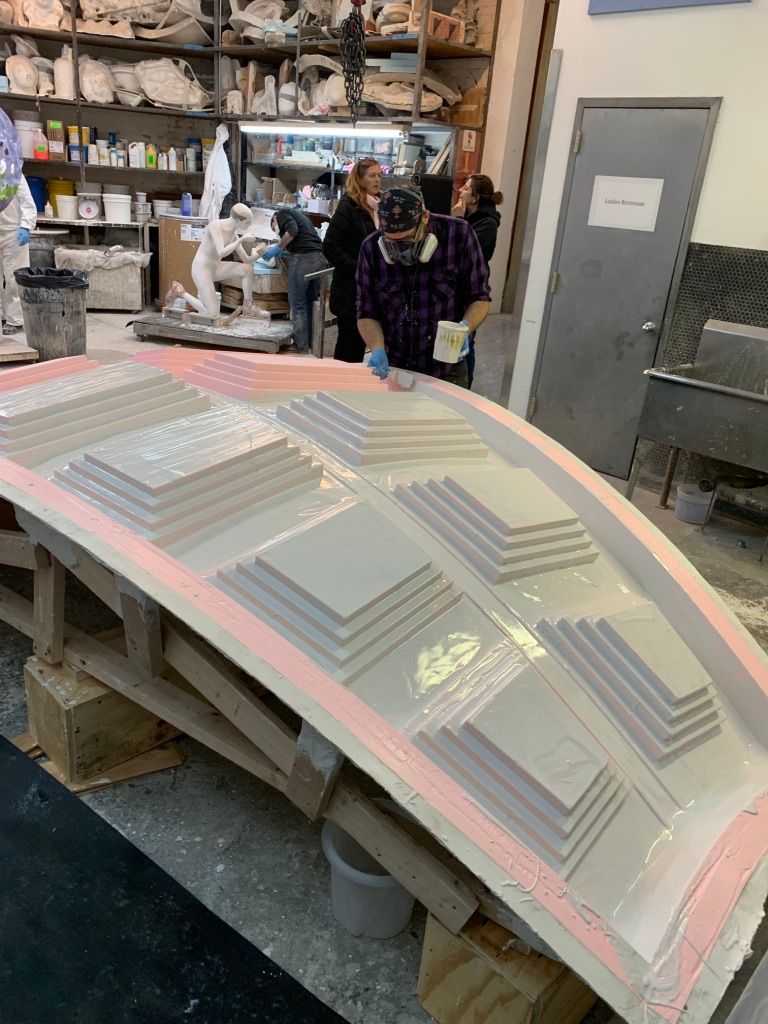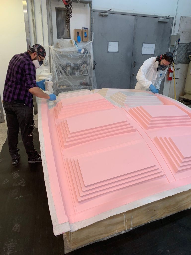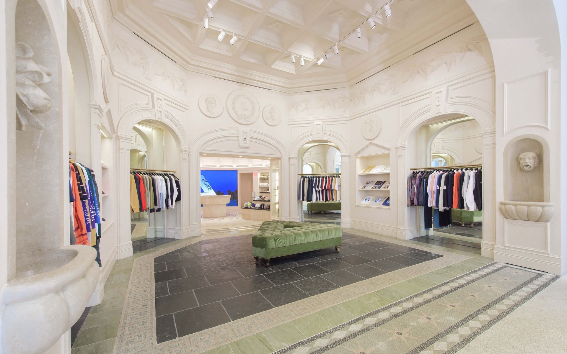 Transitioning from the gallery space to the point of sale area, the volume of the space expands as you are now under a recreation of the famous Pantheon Dome–complete with oculus. Although the opening at Palace is a skylight that brings in only light, not rain like the open oculus of the Pantheon. The dome was molded and created in New York by Atta studios with strict seismic framing and allowances. The dome was shipped in thirteen 400 lb pieces to be hoisted into position below the skylight.