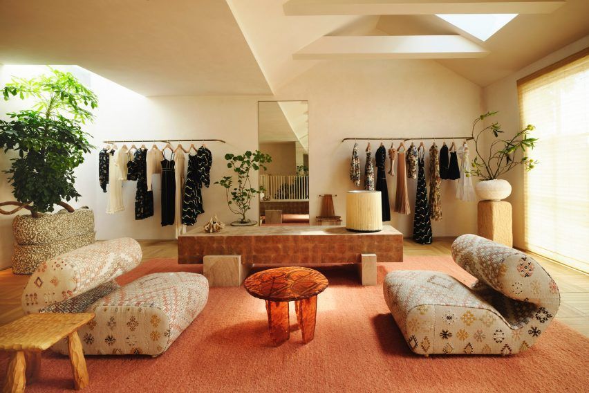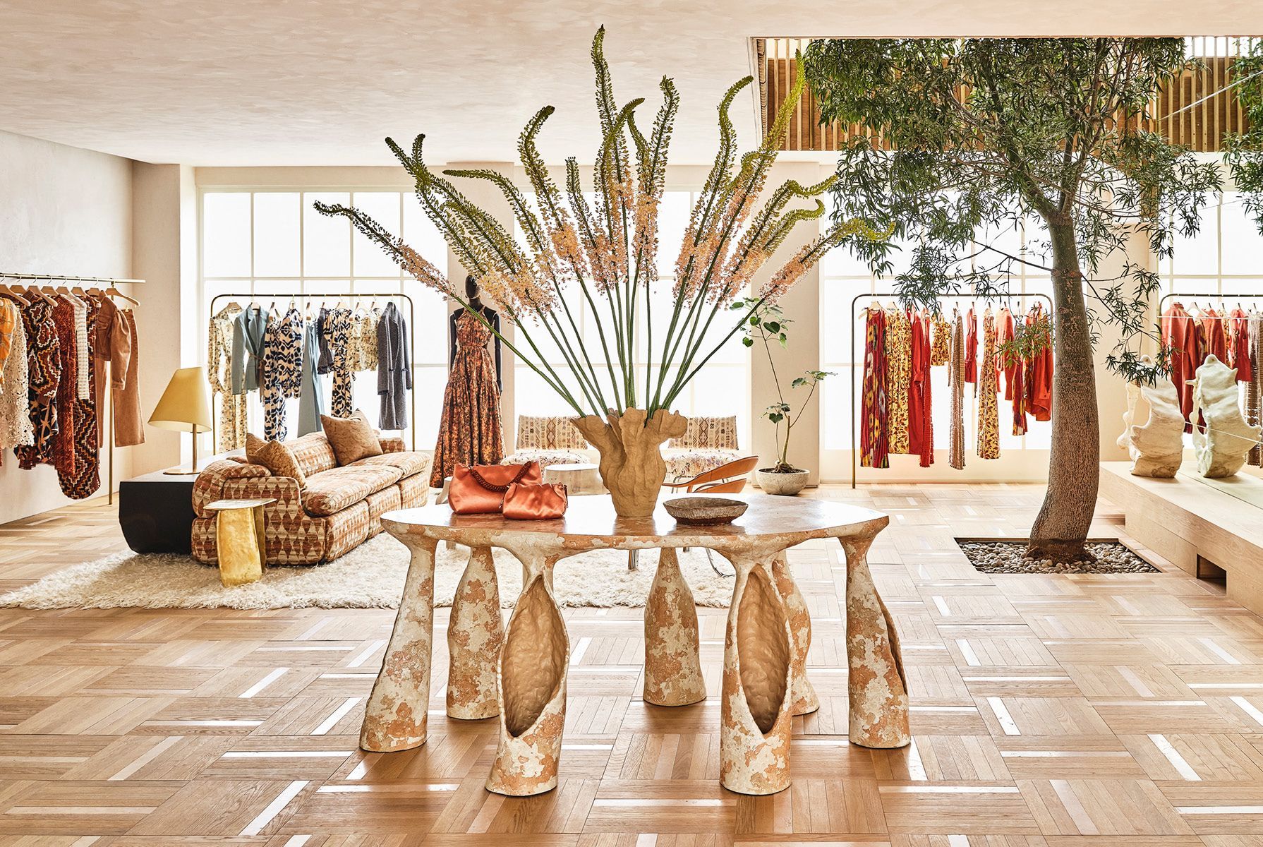 Wearstler integrates natural materials throughout the space’s architecture, complementing Johnson’s haute designs of bold-patterned, ready-to-wear clothing. The atmosphere is deliberately experiential, stimulating the senses with textures from custom and vintage furnishings, subtle wall coverings, unique flooring, and sculptural merchandise displays.